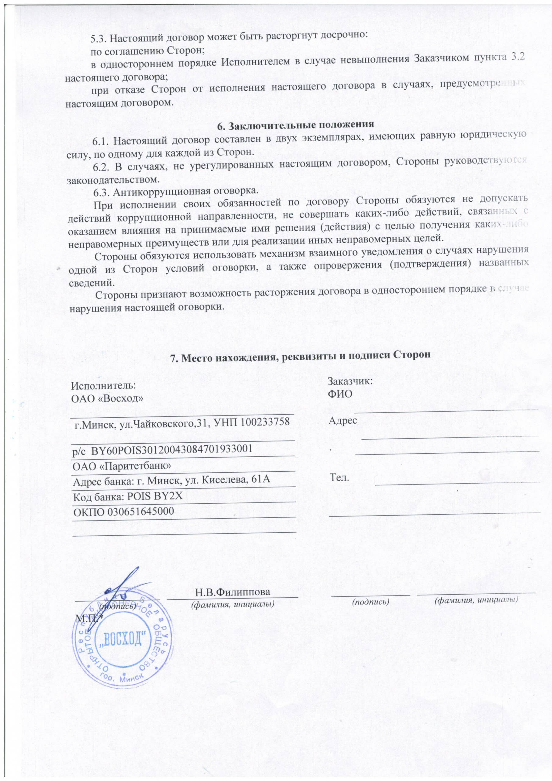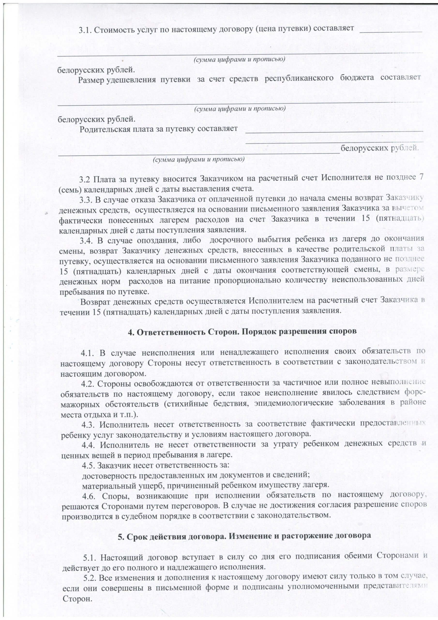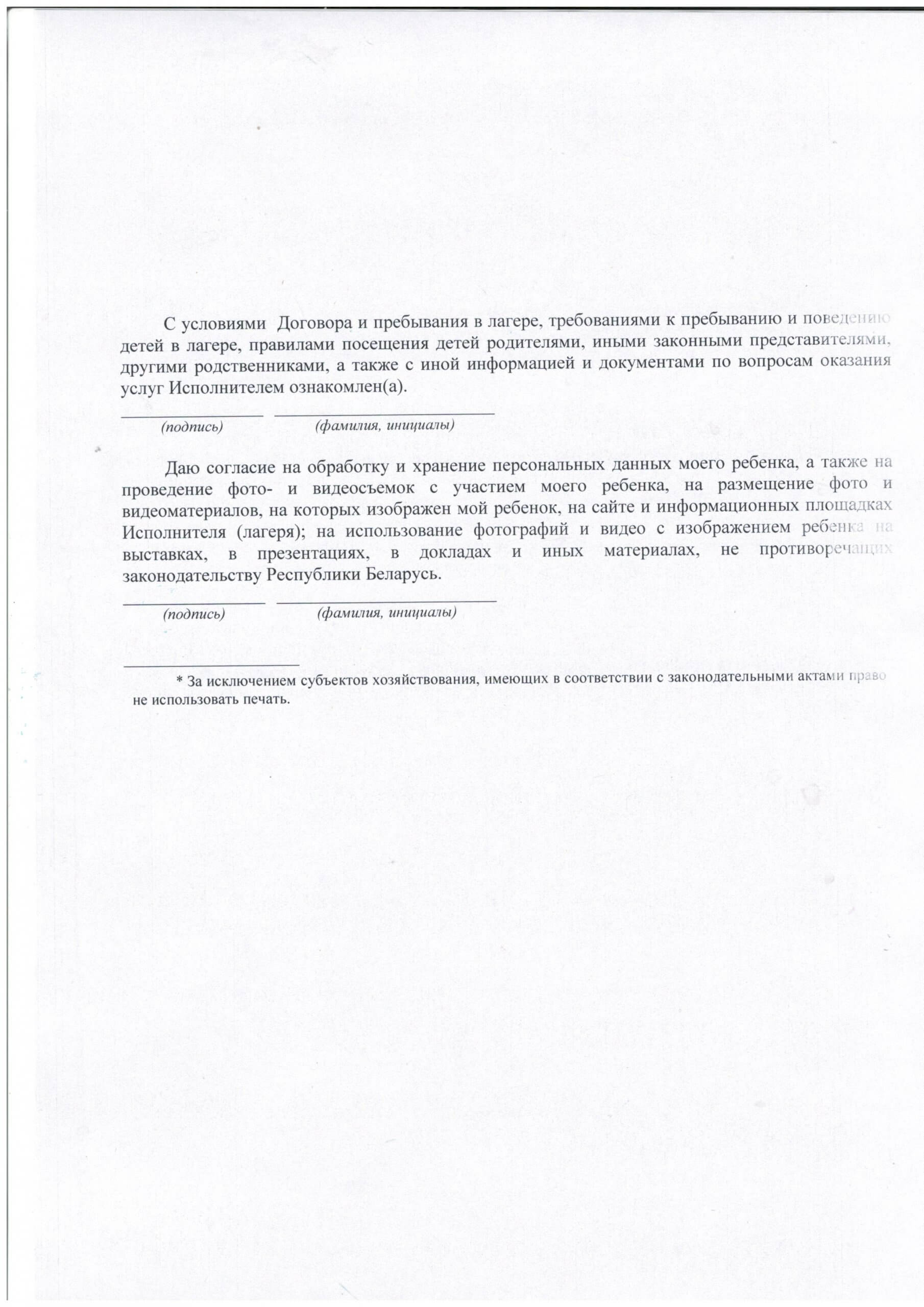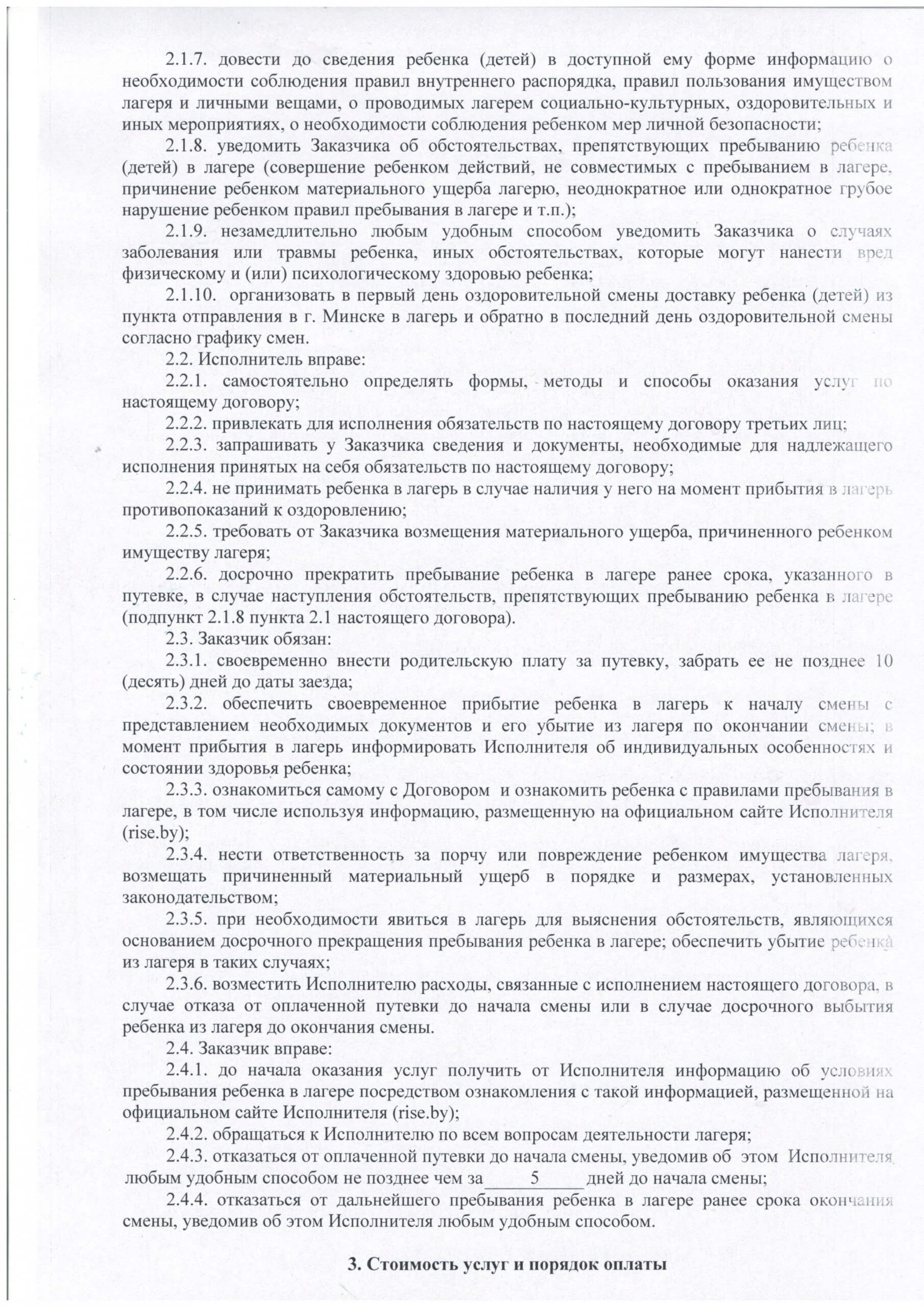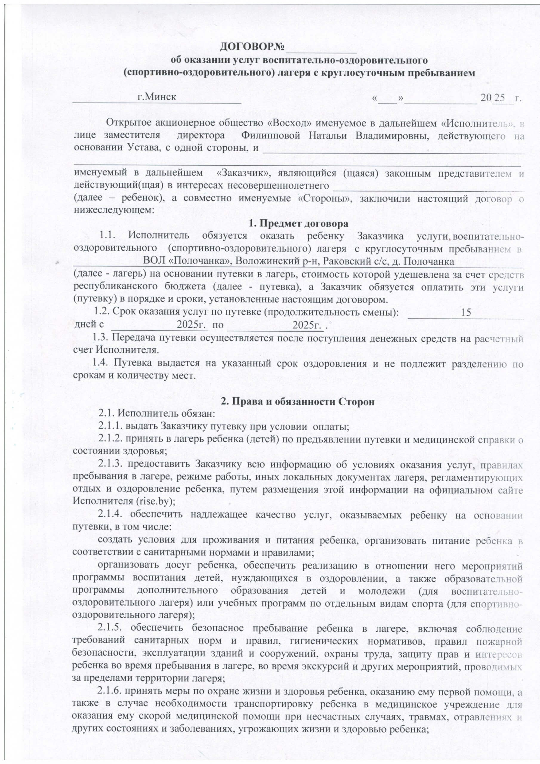 Договор об оказанию ребенку Заказчика услуги ВОЛ «Полочанка»